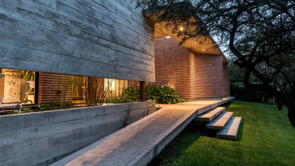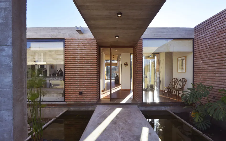 The House is implanted in the ground according to the topography and existing trees. The facade, with a concrete plan that is being cut, officiates of screen of the native vegetation: “the Espinillos”, sculptured trees that generate a filter between the street and the architecture.